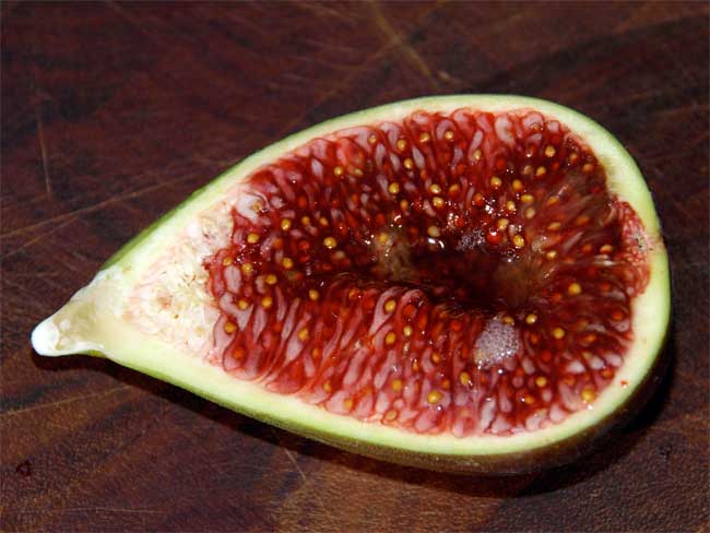 I remember my own adolescence and can empathise with the poor birds, the fruit of the fig sliced open not only looks erotic, but it’s flavour is complex, sweet and exotic.  To bite into the flesh of a fresh fig is a truly sensual pleasure. To me it is curious that the leaf of this, the sexiest of fruits has also become the tool of censorship and prudity since the time of the renaissance. Curiously, the fruit of the fig is not a fruit at all, but a synconium, which is a fleshy hollow receptacle with multiple ovaries on the inside.