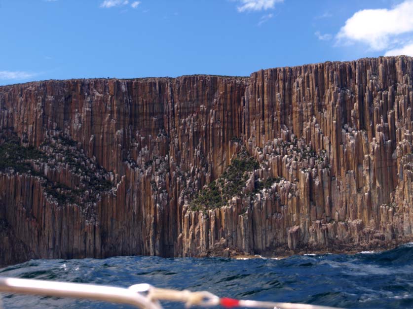 We sail close to the cliffs, the great columns of dolorite towering overhead are jaw droppingly spectacular.  The swell has risen to around three meters, as we are now east enough to be in the rollers from the Southern Ocean that have swung around the southern end of Tasmania. It crashes into the cliffs sending great plumes of spray upwards.