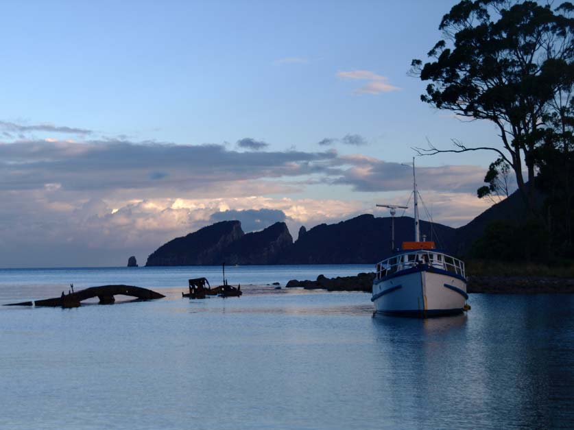 At the tip of the Cape are a series of Rocks named The Lanterns, which rise vertically out of the sea. Two of these are appropriately named The Totem Pole and The Candlestick, sheer towers rising as vertical needles from the sea, both are revered by rock climbers. There is deep water right to their edge, so we round the lanterns and beat into Fortescue Bay. We are heading to a secluded anchorage at the northwest end of the bay, which funnels in to the outlet of Walkers Creek. The hills around the bay are cloaked in tall Eucalpyts which come right to the shoreline, their leaves hanging over the water. It is a truly beautiful place. We are sheltered behind the wreck of the William Pitt, an old dredge that was towed here and sunk to provide shelter from easterly swells, in the company of three other boats.