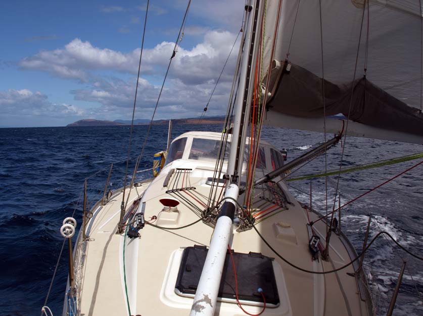 Back in the cockpit we are now comfortably reaching across Mercury Passage towards Isle du Nord at the northern tip of Maria Island. Next I’m on the foredeck trying to get the spinnaker pole jaws around the port sheet so we can jibe downwind towards Schouten Island. A couple of hours later and we are running merrily into Great Oyster Bay at around six and a half knots with a two meter following sea.