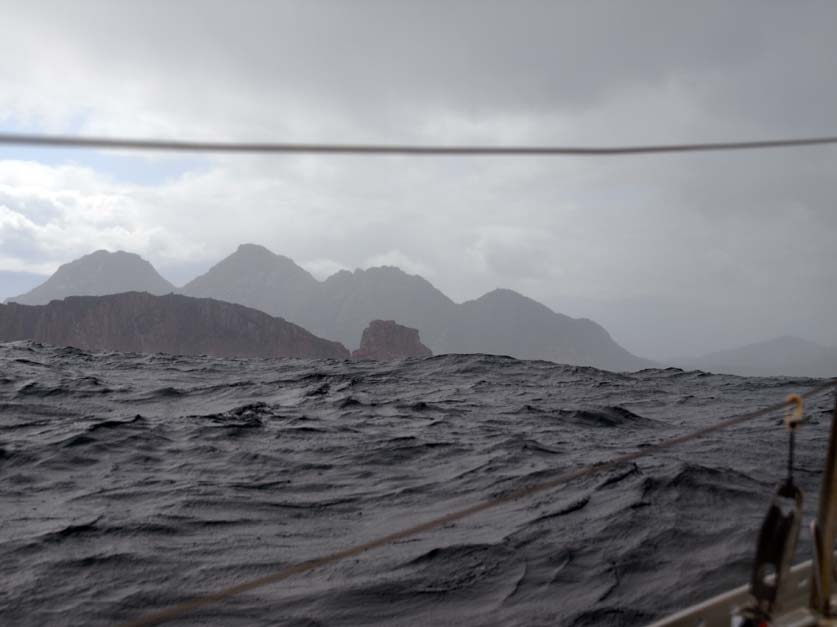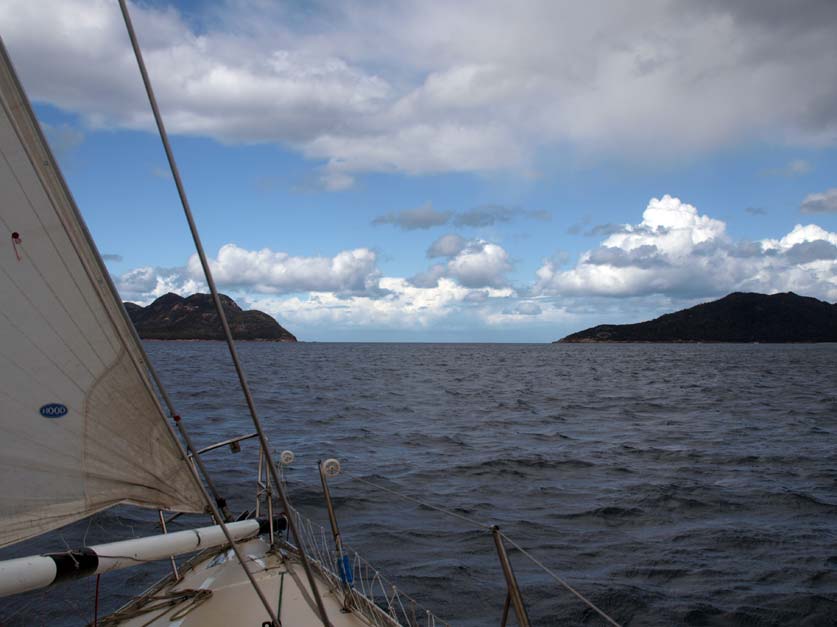 The wind is getting upwards of twenty five knots, so I am sent forward to lower the main, Robert has decided we will run along the peninsular coast with just a jib. This is a pleasant change from when we are racing, in which case he would have the spinnaker and a full main set. Another squall hits us without warning and we are overtaken by sheets of rain, obscuring the Hazards, massive granite tors that tower over the approaching Wineglass Bay.
