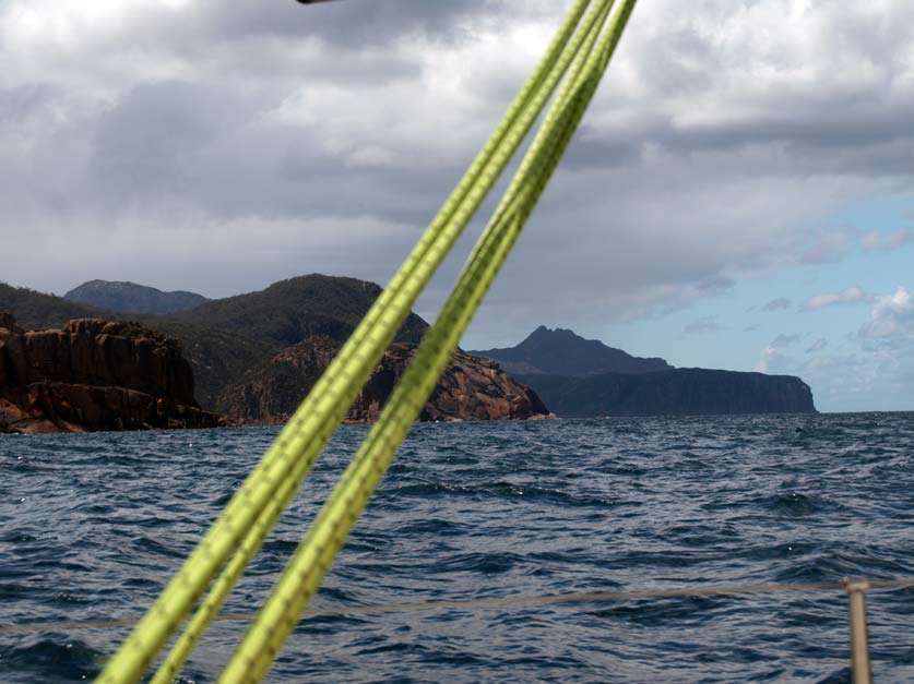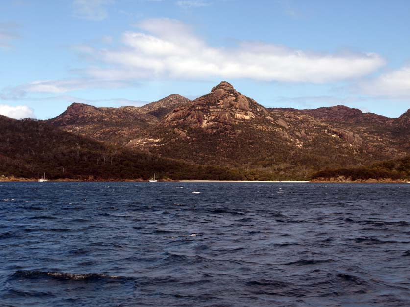 My shift at the helm over, I go below to grab my camera. The coast is spectacular. Beneath towering granite tors there are four vessels at anchor off a sandy cove in the lee of Schouten Island.