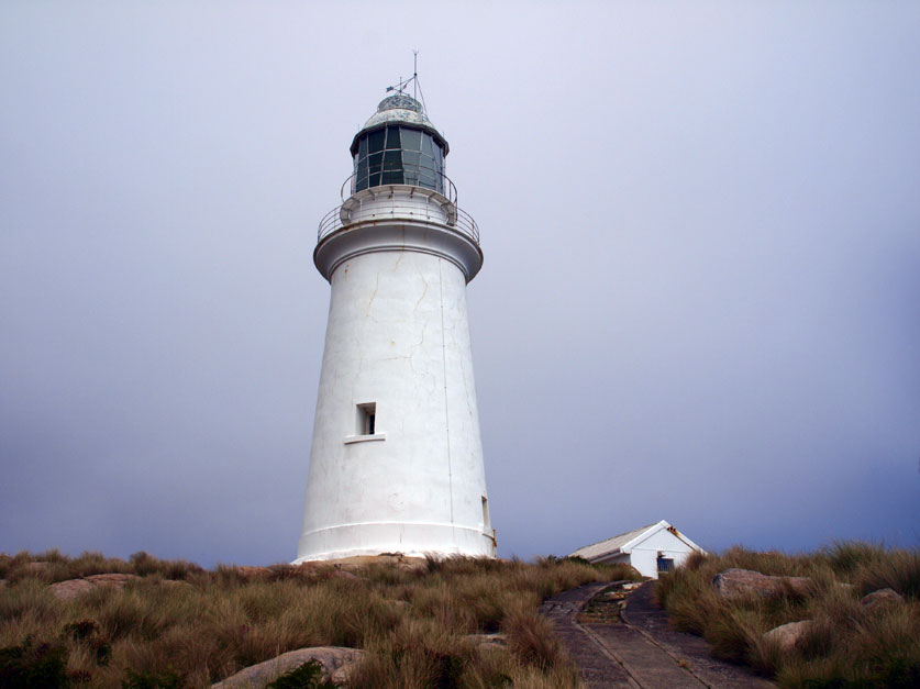 The lighthouse residences are a good 40 minutes walk from the lighthouse itself. There are several buildings, some dating back to 1848, when the Deal Island lighthouse was first commissioned. Nowadays, since the light was decommissioned, the complex is managed by the Tasmanian Parks service. We had our first whiff of bureaucracy as we left the beach, a sign telling us that if we wish to bring our car here it will cost us $60 per annum. The complex is managed by volunteers who do three month stints year round. There is a lengthy waiting list to get a gig. We head for the caretakers residence, one of the more modern buildings in the complex to pick up the key to the lighthouse. I knock on the door and a woman’s voice from inside calls, “Come in, come in, would you like a cup of tea or a glass of water?” Meet Mary and David, the current volunteer caretakers. They have been here for the past six weeks. “Today marks our half way point”, she says, handing me a glass of rainwater. The house is well appointed, not really different from any older farmhouse, but the exception is the view, out of every window breathtaking vistas of Deal Island, cliffs, ocean and forest. It is simply gorgeous. The kitchen is set for Devonshire Tea. Mary tells me she has made scones for our neighbors, the family anchored next door to us, who are currently walking back from the lighthouse. She promises us the same. David gives us directions and the key, and we head off down a farm track through the tussock grass.
