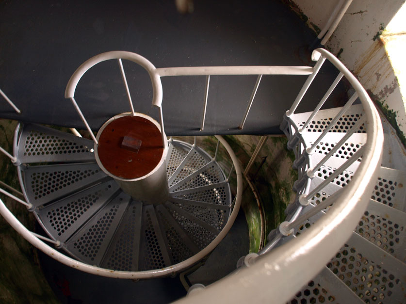 We have climbed 250 meters. Attached to the main lighthouse is a generator room which is still operational. We open the door to the tower and ascend a steep iron spiral staircase to the light room.