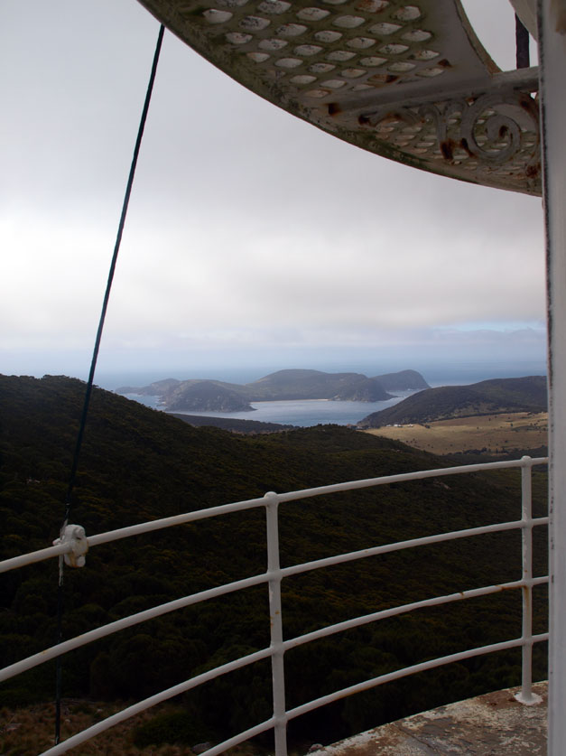 The light room looks as if it is till in operation. Heavy canvass sheets cover the windows to protect the prisms. The control panel is still there, as well as a wind up telephone, and operational instructions. Apparently the light was fired up by enthusiasts in 2000 to see in the new millennium. We open the door and step out onto a little balcony that circles the tower.
