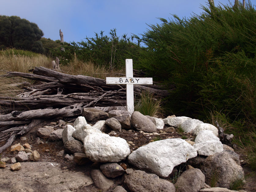The view is incredible, but the wind is howling so hard it feels as if we could be blown off. I get signal and ring my Dad, I know how much he would love to be here. Down in Squally Bay I see a lone sea eagle circling, as bullets of wind etch a pattern on the turquoise and deep blue water. Just beneath the lighthouse is a little grave marked by a whitewashed wooden cross and a circle of stones with the simple inscription “BABY”.