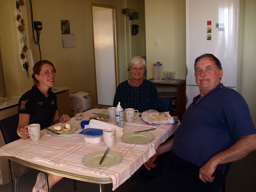 The table is laid, and we are greeted with fresh scones, jam, and pressurised faux cream in a spray can. The caretakers must assemble all the food they need for three months, as there is no resupply. Mary brought along 40 liters of cask wine and dozens of cans of cream, the latter to treat the yachties and kayakers who risk the pernicious nature of Bass Strait weather to worship at this most hallowed of shrines. They are both people of generous spirit, who retired to live aboard their 45 foot yacht when they are not house sitting or minding lighthouses. I mention the first light keepers’ numerous offspring, and David quips, “Well, thats what you get when you don’t have any telly.” I wonder how he whiles away the lonely nights while the wind howls up from Murray Pass. When I mention we have a copy of last weeks Australian on board, his eyes light up. They agree to meet us at the BBQ on the beach later on, and we head back to the boat.