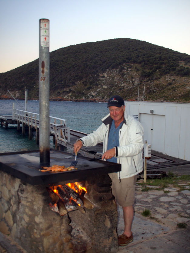 Back onboard, Robert has prepared all the goodies for the BBQ, so we load it all into the tender and transport it back to the beach. There is a sizable swell surging on the beach. The boat ploughs into the sand with a jolt and I end up on my arse in the water. No problem, because the next wave comes over the transom and Robert cops it. All fair in love and war, and we both traipse up the beach wet but happy. The neighbours have already lit the BBQ. The wood is provided by the caretakers, who collect it from Winter Cove on the east side of the island. The tidal movement seems to wash lots of driftwood up there cast aside by merchant ships. This would have to be one of the most scenic public BBQ spots I have ever cooked on. The coin-in-the-slot numbers on the banks of the Yarra are grand, but they have nothing on this.