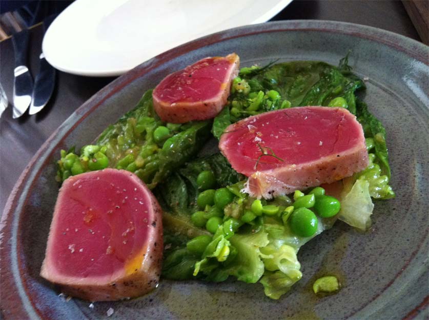 Some deliciously elastic Ciabatta appeared on the table with locally pressed Diana Olive Oil, followed by Tuna with Fresh Peas and wilted cos in a salty dill dressing. The Tuna was almost sashimi, just lightly white from a gentle marination in lemon acid on the outside, with just a hint of dill, it married superbly with the Alvarinho.