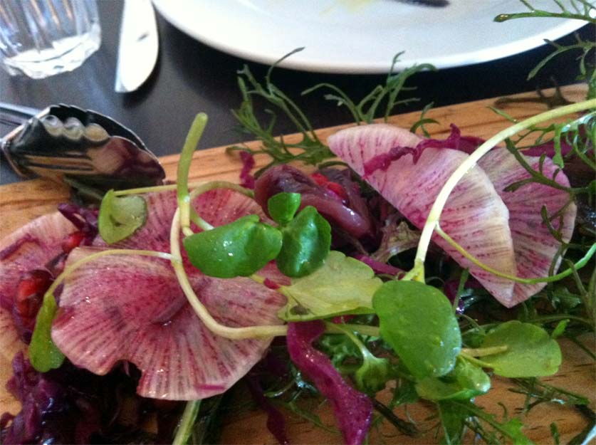 The next dish was sugar cured cold smoked muscovy duck, garnished with thinly sliced melon radish that looked like something out of Alice in Wonderland, with red cabbage, a little mustard cress for heat, pomegranate seeds, and to lead the palette along, again a touch of dill.