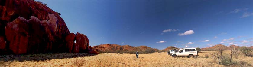 Our first stop is at an extraordinary rock formation, where a great slab of granite has been split from the main tor. Its shape resembles a great cumulus cloud, and we are told this is Nyingala, the rain cloud spirit. I keep my fingers crossed he doesn’t want to perform his good works for us, rain is always disastrous for traveling in this country. We continue on over the trackless plain to cross through a pass. The country recedes, and the horizon opens up before us to reveal in the distance the sandhills of the Great Victoria Desert which lap against the shore of the rocky Everards like a frozen sea.