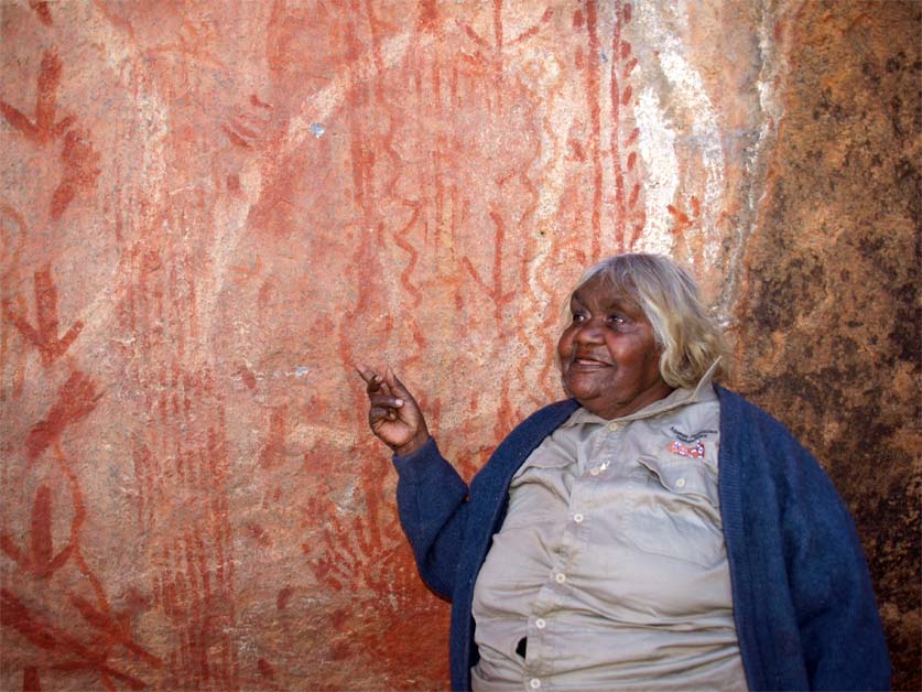 On a hidden wall in the shade we are shown a stunning array of ochre paintings, one shows the tracks of the illusive itjari itjari – the rare and endangered marsupial mole. We follow the dreaming trails of Wannampe – the giant serpent, the Ngintaka, the giant perente lizard, and tjaala, the honey ants.